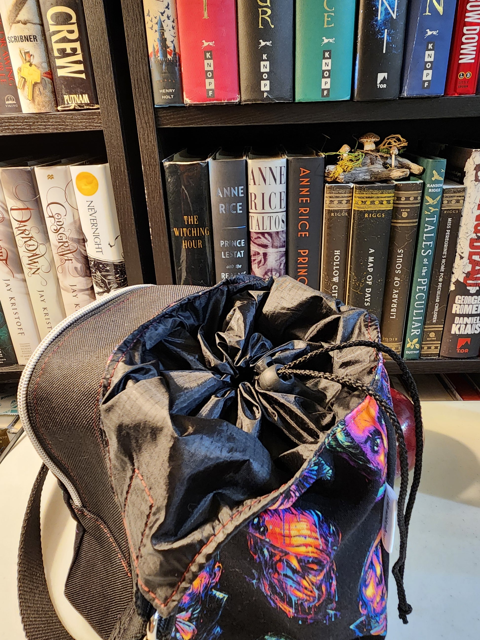 Large outer pocket can easily fit phones, keys, wallet and other items. Lining has a drawstring feature for snugness.