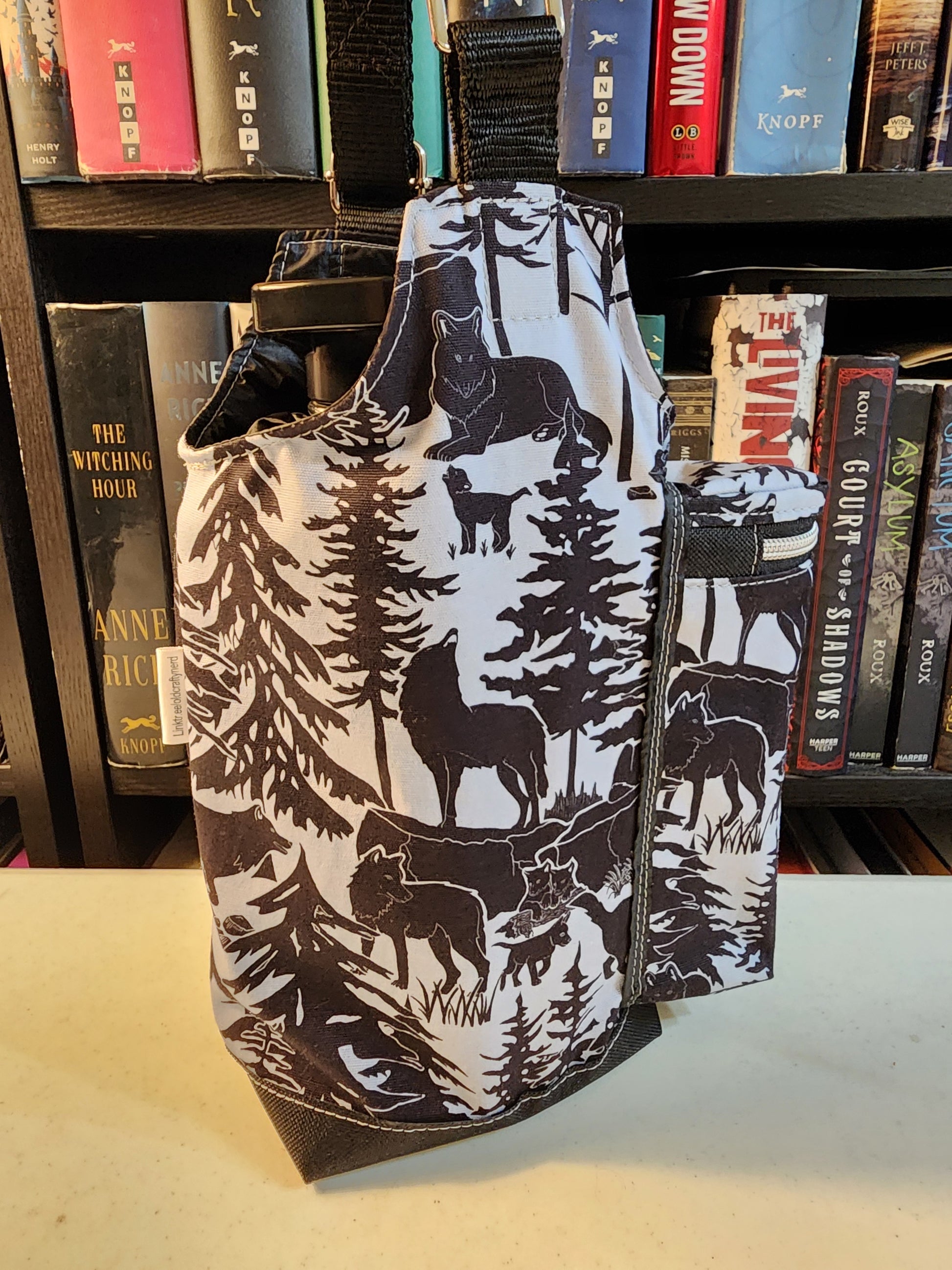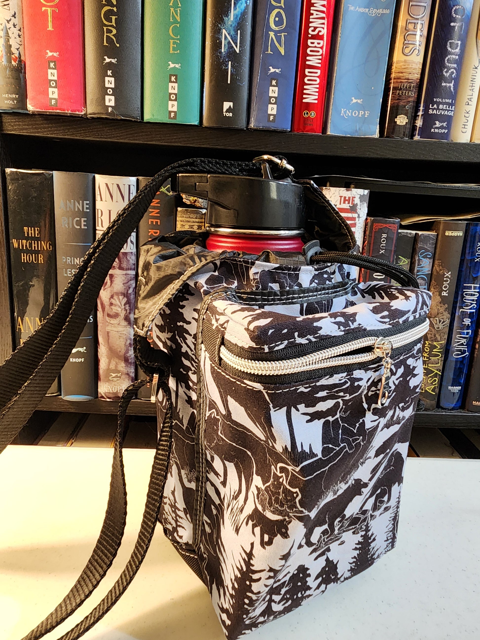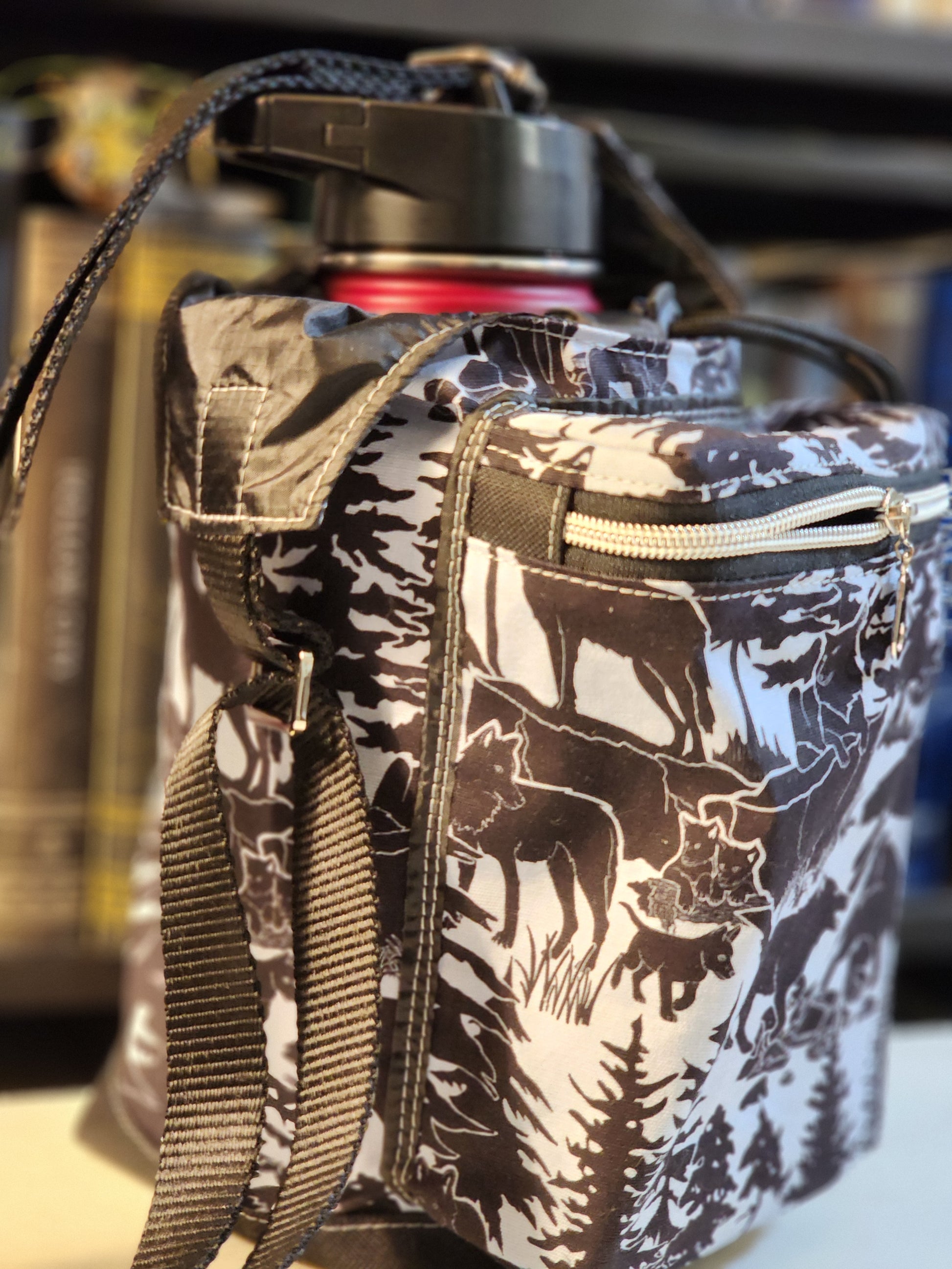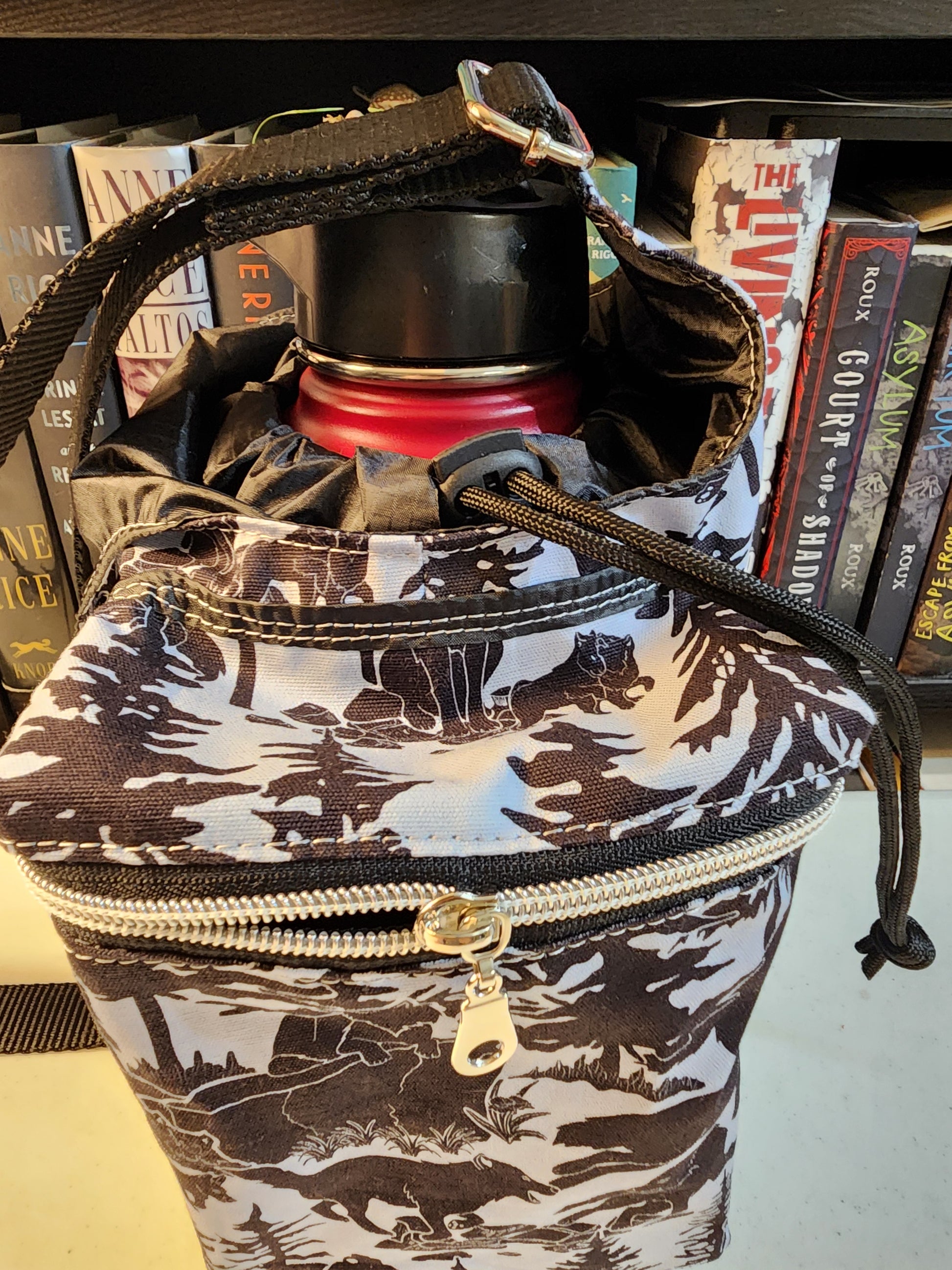 Large bag compartment fits 64 oz flask or 40 oz Stanley with handle.